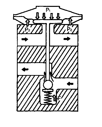 When the heat load to the air conditioning system increases, the refrigerant temperature at the evaporator outlet rises and therefore the pressure P(1) around the temperature sensing area increases. As this pressure P(1) becomes higher than the sum of the evaporator outlet (low-pressure side) pressure P(2) and the spring force F (P(1) > P(2) + F), the diaphragm is pressed down, moving the valve ball connected to the diaphragm clear of its seat. This increases the flow of the refrigerant.