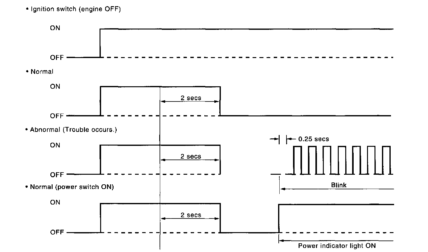When any on-board diagnostics item is malfunctioning, the display on the AT OIL TEMP warning light blinks from the time the malfunction is detected after starting the engine until the ignition switch is turned OFF. The malfunctioning part or unit can be determined by a DTC during on-board diagnostics operation. Problems which occurred previously can also be identified through the memory function. If the AT OIL TEMP warning light does not show a problem (although a problem is occurring), the problem can be determined by checking the performance characteristics of each sensor using the select monitor. Indicator signal is as shown in the figure.