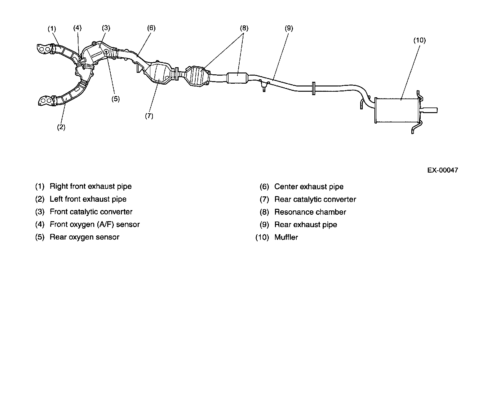 General^ The exhaust system consists of front exhaust pipes, catalytic converters, a center exhaust pipe, a rear exhaust pipe and a muffler. The front catalytic converter and rear catalytic converter are incorporated in the center exhaust pipe.