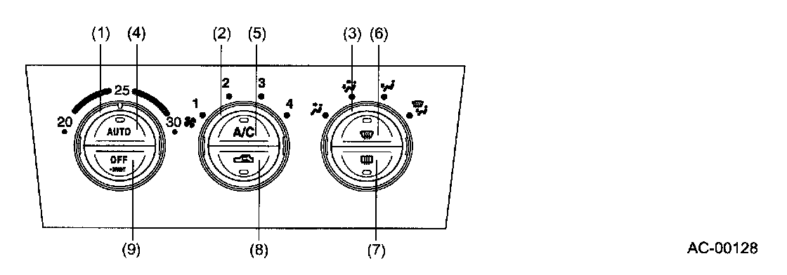 By operating this switch the system will operate in full automatic mode The air flow, air outlets switching, air intake mode switching, and the A/C compressor engagement/disengagement are automatically controlled.