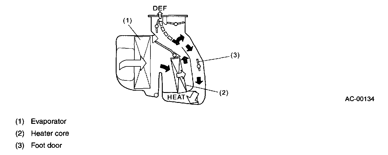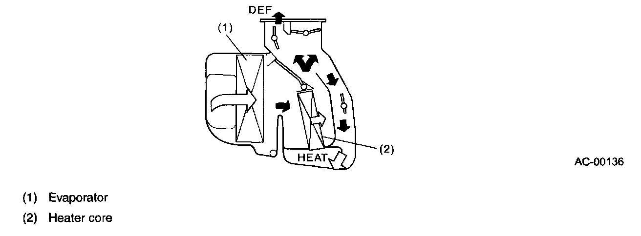 - The air from the evaporator passes through the heater core and the warmed air flows through the defroster door to the defroster (DEF) duct.