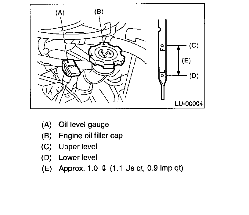 CAUTION: When replenishing oil, it does not matter if the oil to be added is a different brand from that in the engine; however, use oil having the API classification and SAE viscosity No. designated by SUBARU.