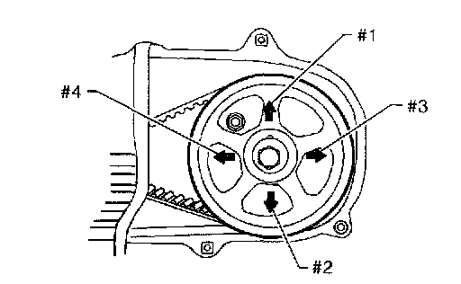 ^ To set the #3, #2 and #4 cylinder pistons to their top dead centers on compression stroke, turn the crankshaft pulley clockwise 90° at a time starting with arrow mark on camshaft sprocket (LH) facing up.