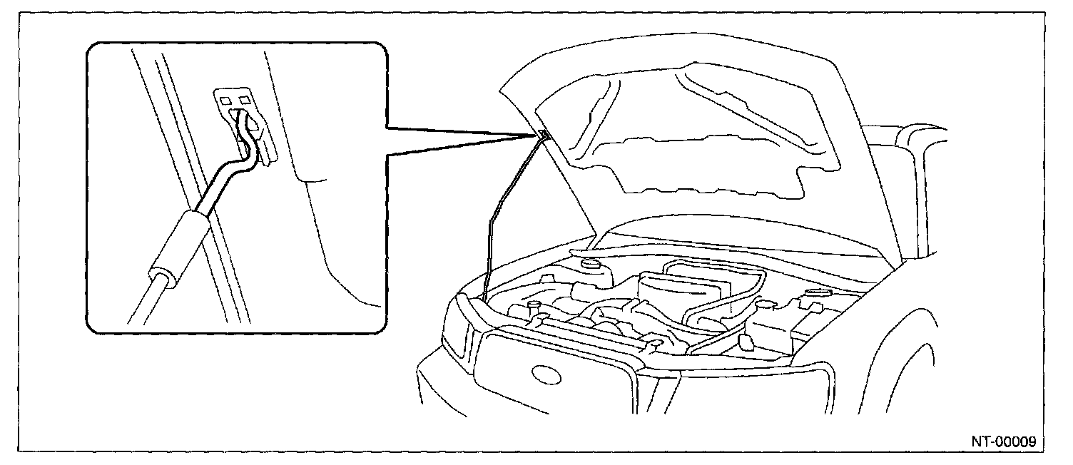 NOTE: Before setting the hood in this position, remove the windshield washer hose attaching clip from the hood.