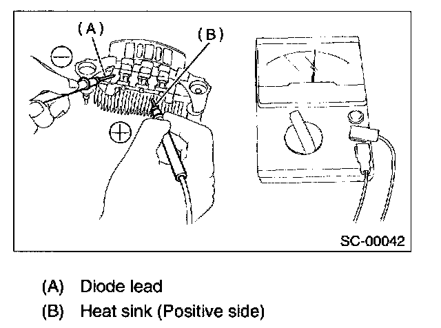 Check for continuity between the diode lead and positive side heat sink. The positive diode is in good condition if resistance is 1 Ohm or less only in the direction from the diode lead to heat sink.