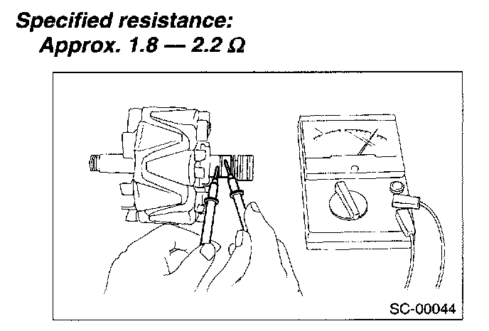 Check the continuity between slip ring and rotor core or shaft. If resistance is 1 Ohm or less, the rotor coil is grounded, and so replace the rotor assembly.