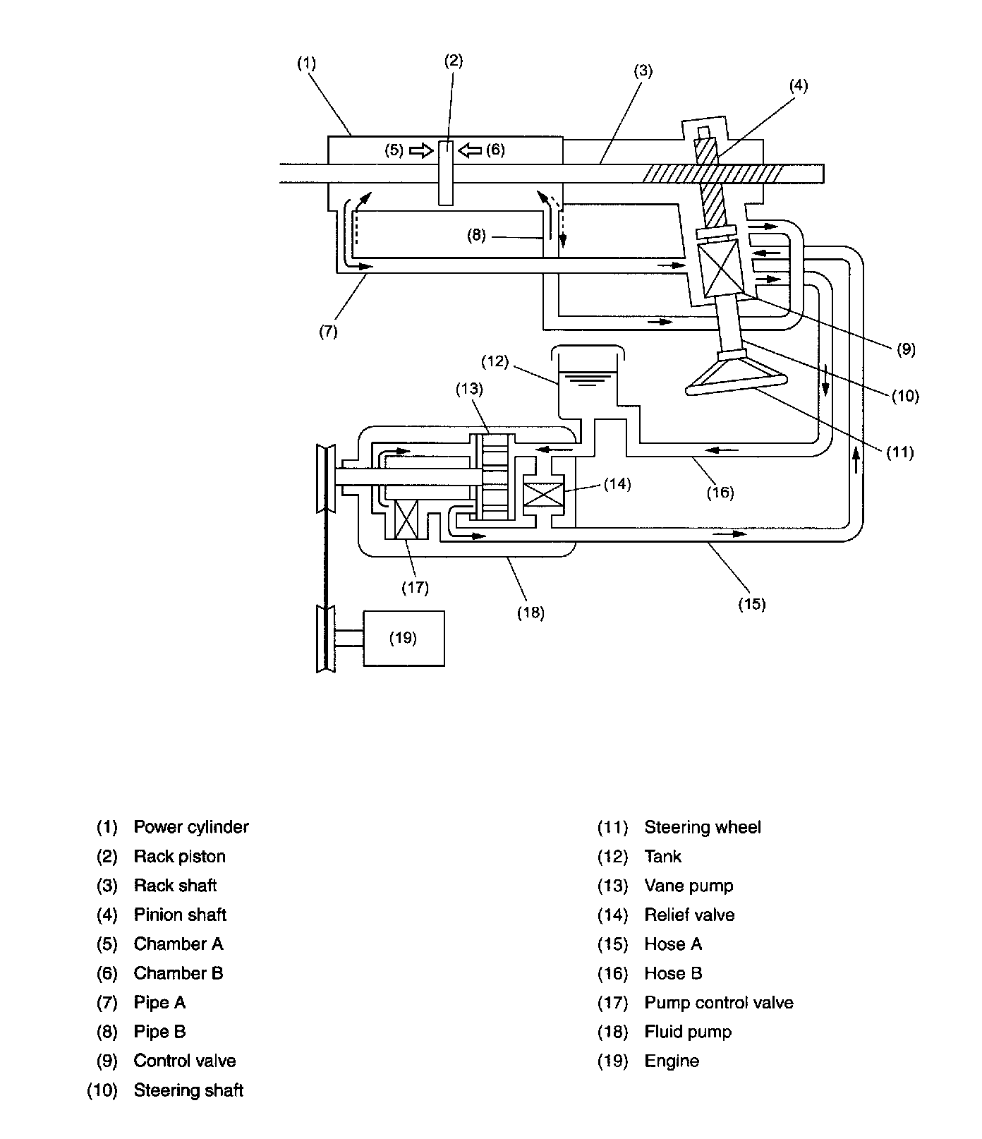 ^ Movement of the rack piston causes the fluid in the other chamber to return to the reservoir tank via pipe A or B. control valve, and hose B.