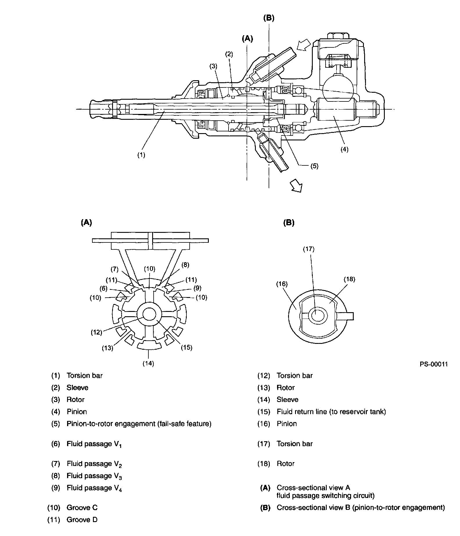 The rotary control valve consists of a rotor (which rotates together with the steering shaft), a pinion (which is connected to the rotor and torsion bar), and a sleeve (which rotates together with the pinion). The rotor and sleeve have grooves C and D, respectively, which form fluid passages V, through V4.
