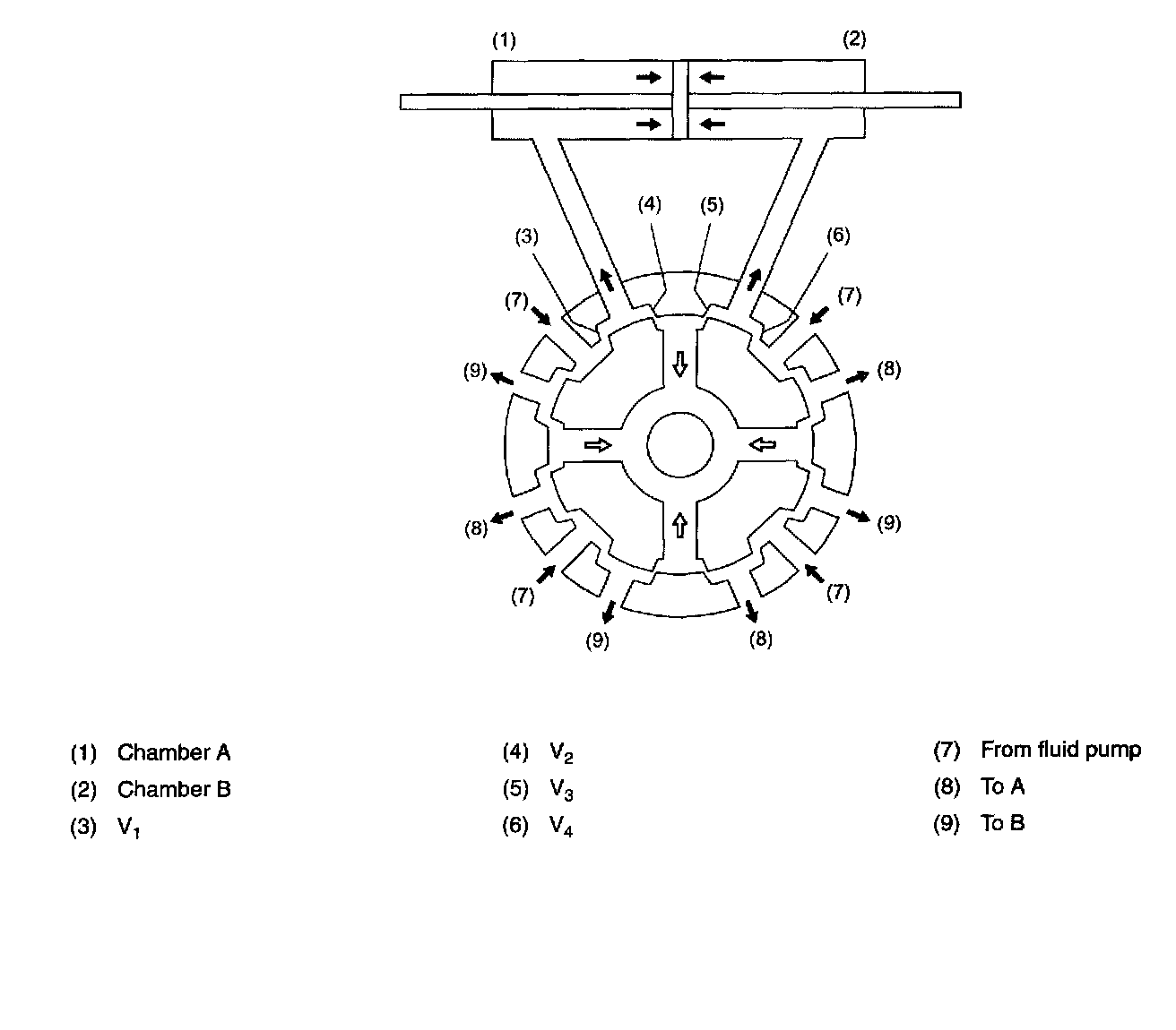 When the steering wheel is turned to the right, for example, fluid passages V, and V3 are opened while fluid passages V2 and V4 are nearly closed.