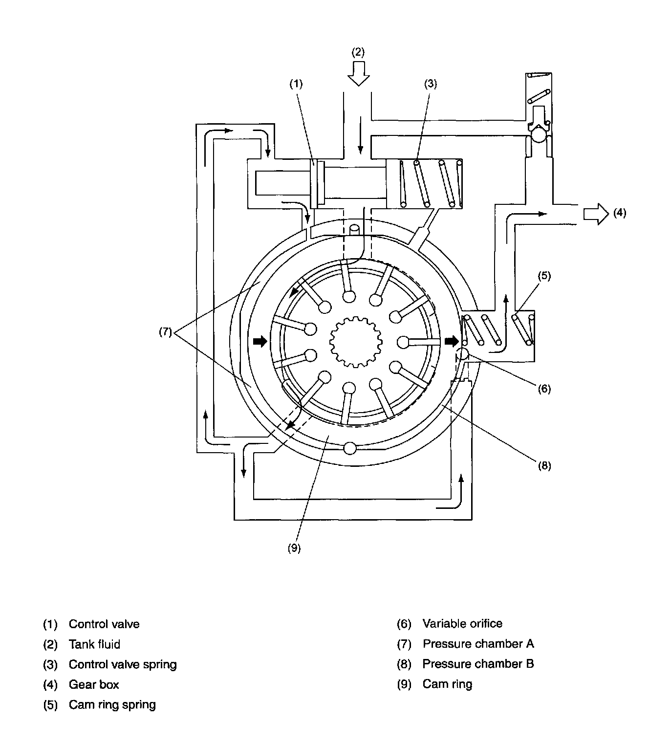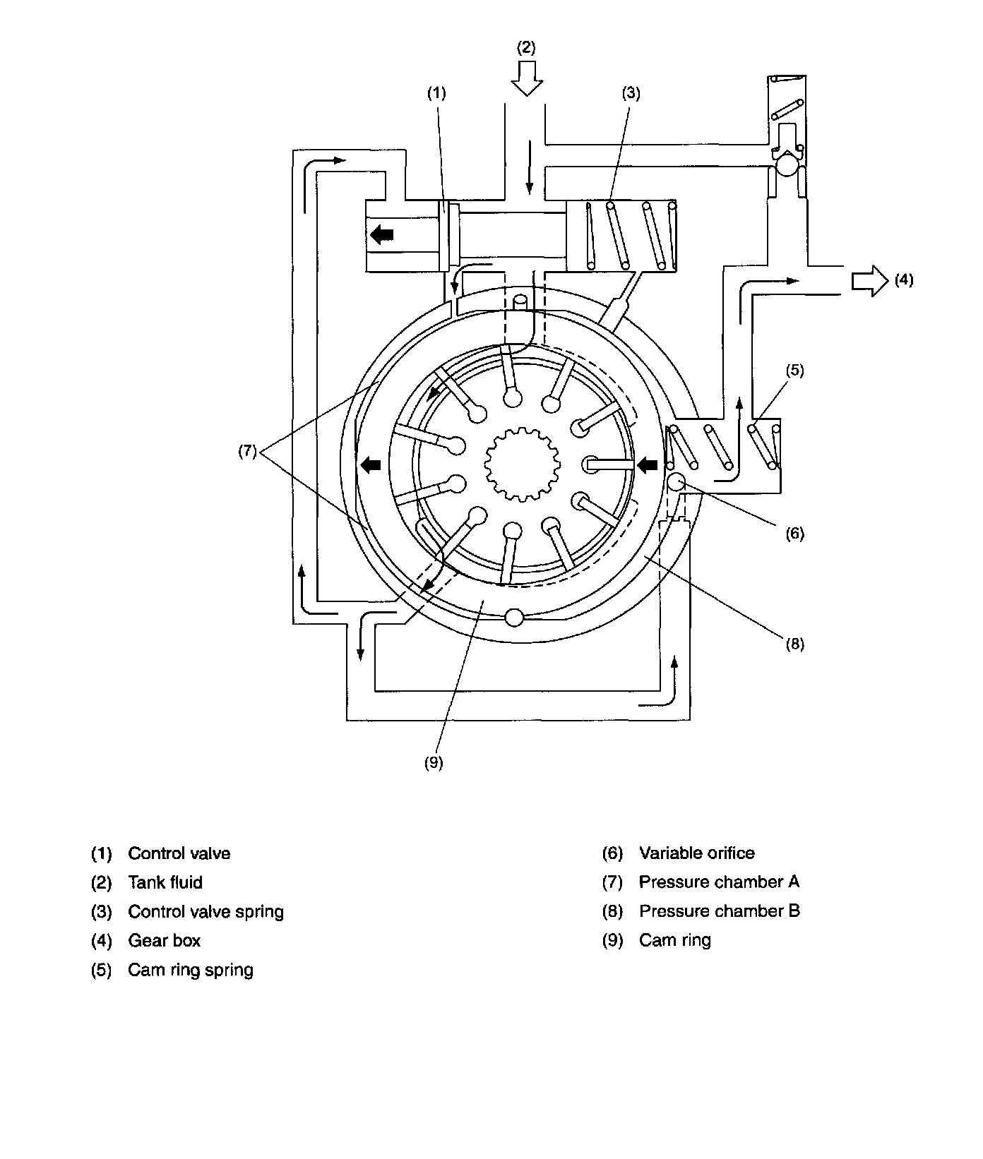 ^ The fluid pump is a variable capacity type vane pump whose delivery rate per rotation decreases as the engine speed increases. The pump is integral with a pump control valve and relief valve.