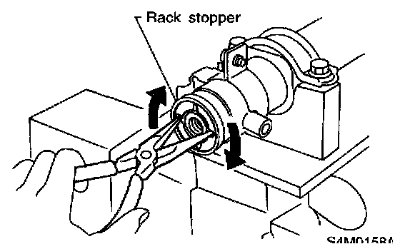 13) Using a sharp pointed pliers, rotate the rack stopper in direction of the arrow until end of the circlip comes out of stopper. Rotate the circlip in opposite direction and pull it out.