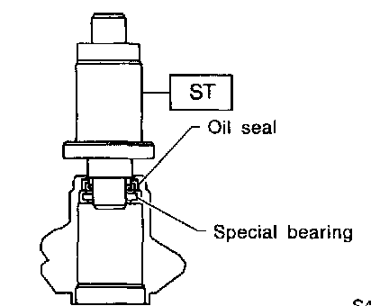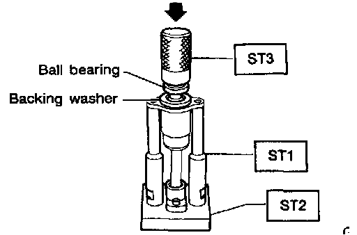 7) Attach the bearing to ST, and then position in value housing. Using the ST and press, install the special bearing in valve housing.
