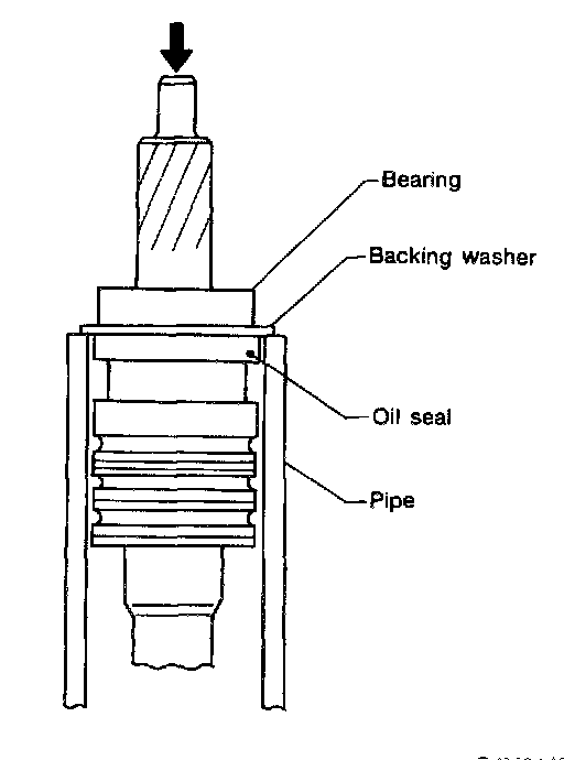 12) Press out the bearing together with the back up washer using pipe of I.D. 38.5 to 39.5 mm (1.51 6 to 1.555 inch) and press.