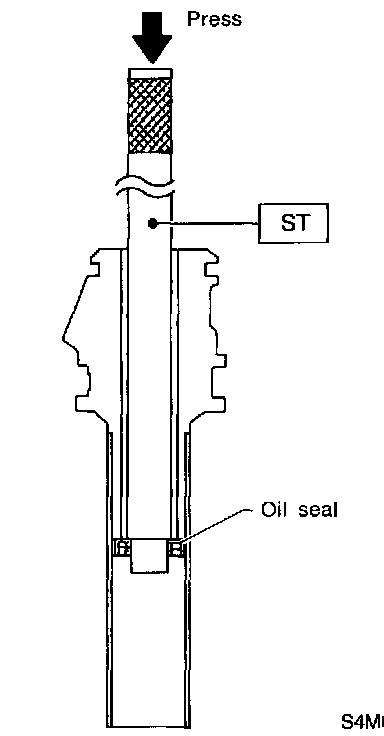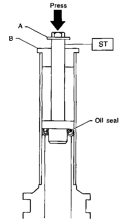 2) Install the oil seal in correct position as shown in the figure. Push the oil seal using a press until portion A of ST contacts face of B.