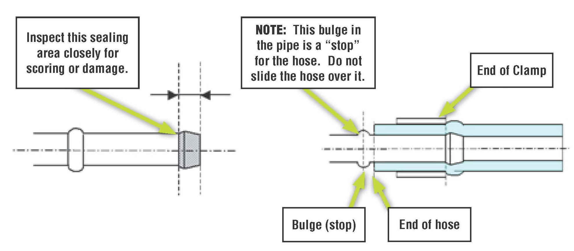 ^ In the event a hose needs replacement, once disconnected, carefully inspect the sealing area of the companion metal pipe for any damage or scoring as shown in the shaded area of the illustration.