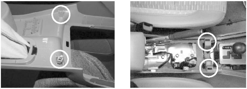 6) Remove the upper console. Make sure not to scratch or damage the console cover or console box. Note: Ensure that the metallic trim clips on the underside of the upper console are present and intact for re-installation (see image).