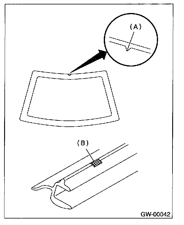 5. Remove the backing of double-faced adhesive tape, and then align the molding mark (B) to notch (A). Attach the molding around the edge of glass, and then press it evenly to fit.