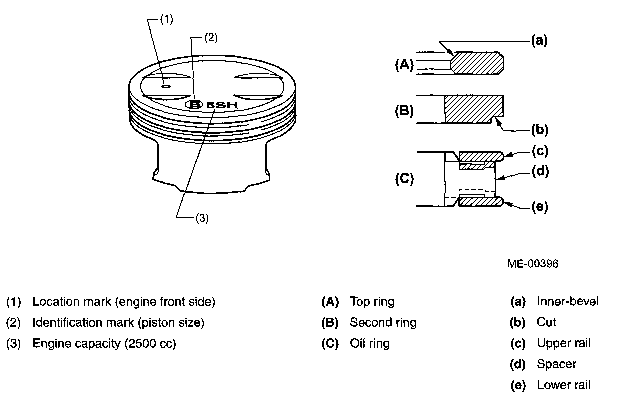 ^ Three piston rings are used for each piston - two compression rings and one oil control ring. The top piston ring has inner bevels and the second piston ring has an interrupt (cut) on the bottom outside to reduce oil consumption.