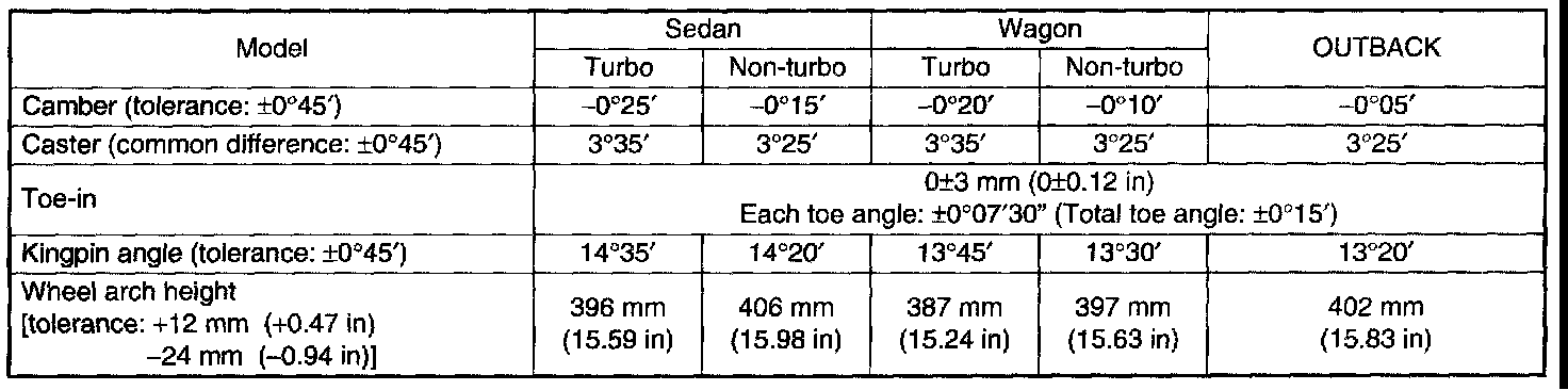 ^ The other items indicated in the specification table cannot be adjusted. If the other items exceeds specifications, check suspension parts and connections for deformities; replace with new ones as required.