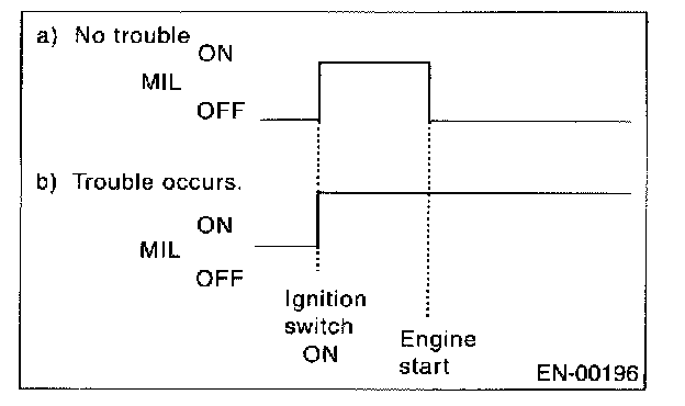 ACTIVATION OF CHECK ENGINE MALFUNCTION INDICATOR LAMP (MIL)1. When the ignition switch is turned to ON (engine off), the CHECK ENGINE malfunction indicator lamp (MIL) in the combination meter illuminates.