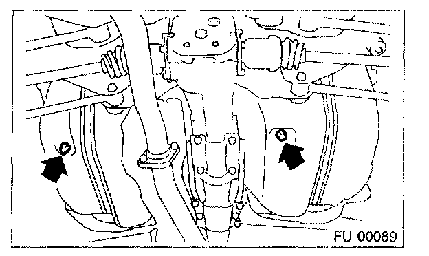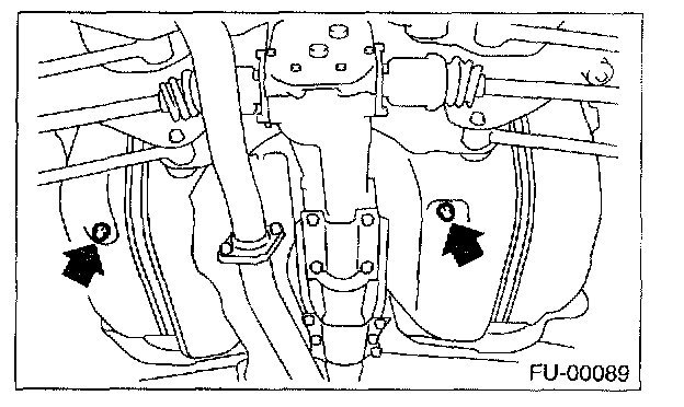 5. Drain the fuel from the fuel tank. Set a container under the vehicle and remove the drain plug from the fuel tank.