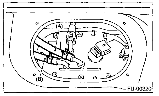 11. Move the clip and then disconnect the fuel return hose (A) and jet pump hose (B).