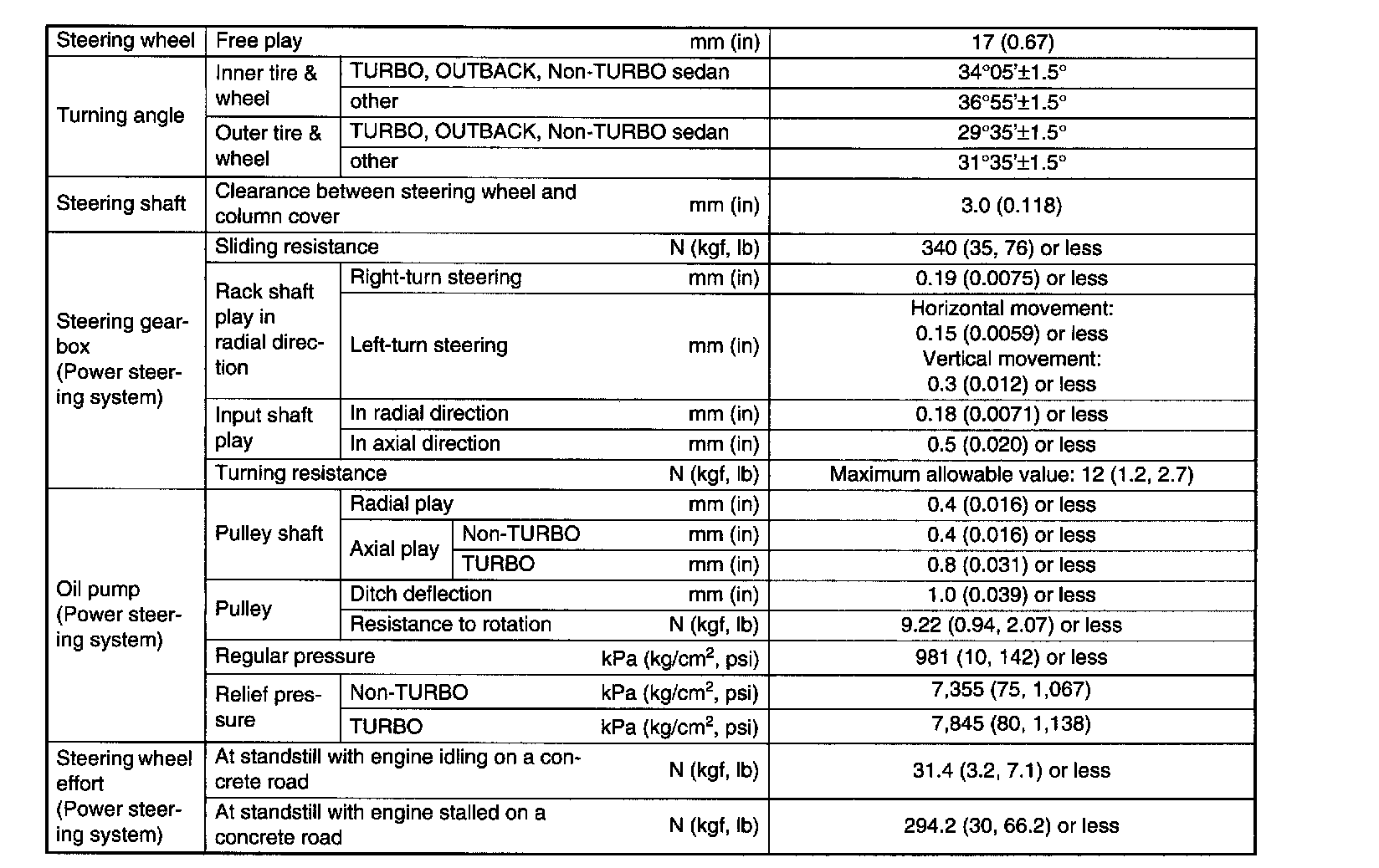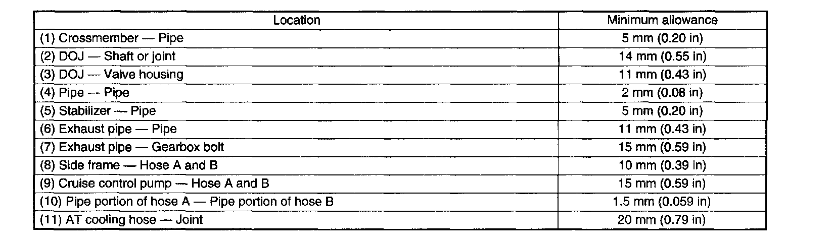 This table lists various clearances that must be correctly adjusted to ensure normal vehicle driving without interfering noise, or any other faults.