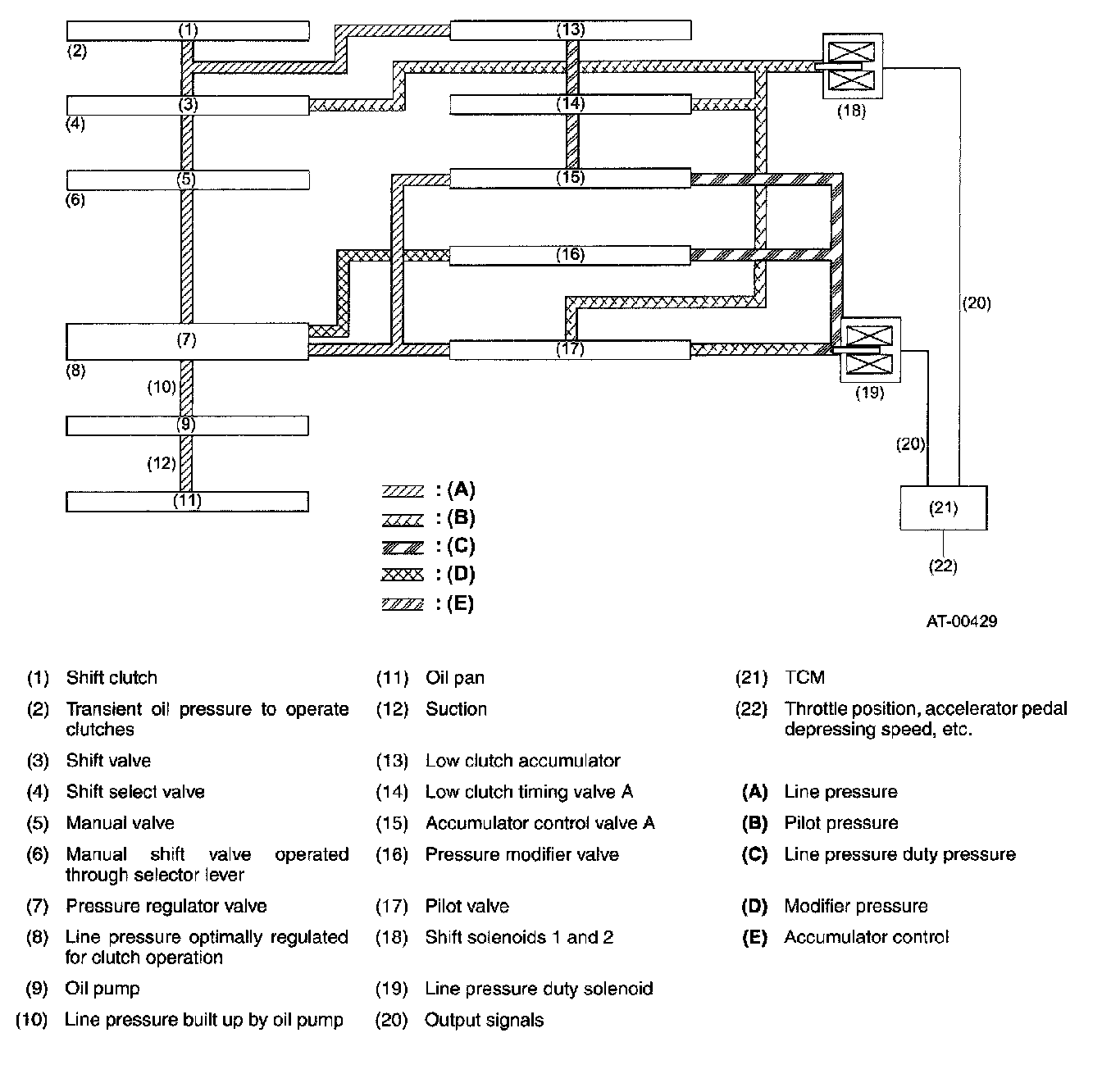 The line pressure which engages shift clutches to create 1st to 4th speeds is controlled by the TCM to meet varying operating conditions.