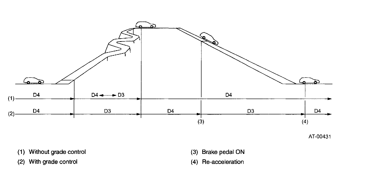 When the vehicle is descending a steep slope at a speed of approximately 80 km/h (50 MPH), a 4th to 3rd downshift occurs automatically when the brake pedal is depressed. This gearshift control is cancelled when the accelerator pedal is depressed.