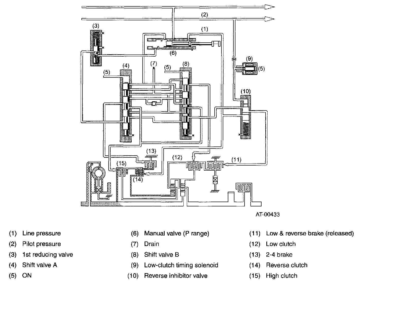 In this condition, the low & reverse brake does not engage since the ATF flowing from the manual valve is blocked by the reverse inhibitor valve.
