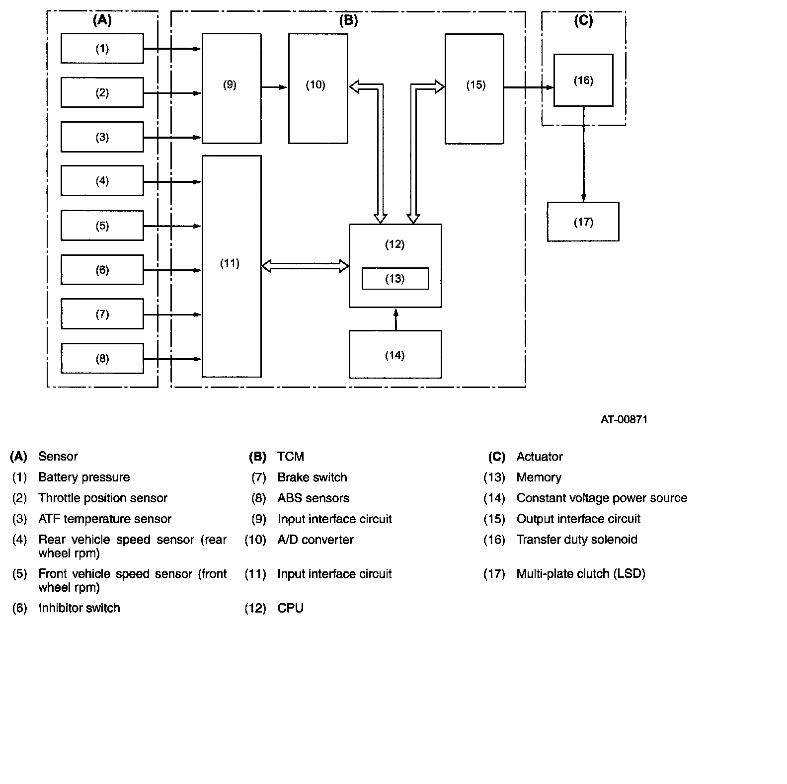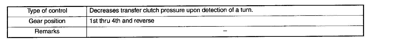 The TCM is constantly monitoring the driving conditions of the vehicle using the eleven input signals. Based on the conditions it has determined, the TCM adjusts the duty ratio of current to the transfer duty solenoid thus changing the engagement of the multi-plate clutch. The input signals are used also for automatic transmission control.