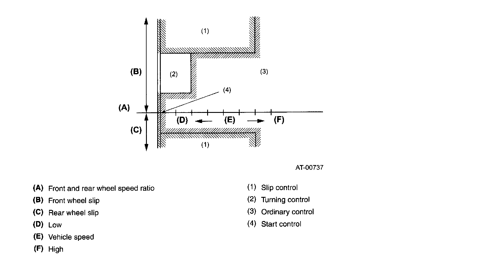When front or rear wheels start slipping with the vehicle running slower than the predetermined speed, the TCM makes control to increase the differential action limiting torque.
