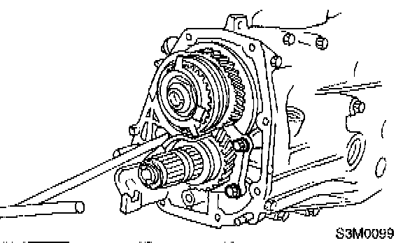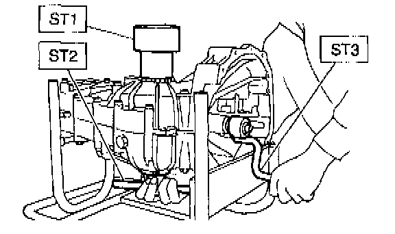 10) Screw the retainer assembly into left case from the bottom with ST2. Fit ST3 on the transmission main shaft. Shift gear into 4th or 5th and turn the shaft several times. Screw in the retainer while turning ST3 until a slight resistance is felt on ST2.