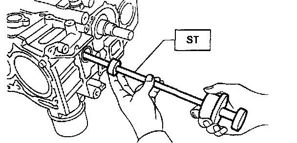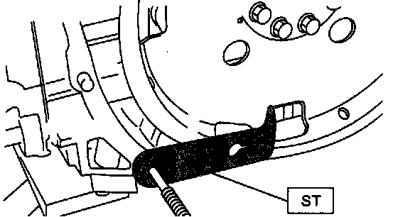 12) Remove the drive plate. (AT vehicles) Using the ST, lock crankshaft.