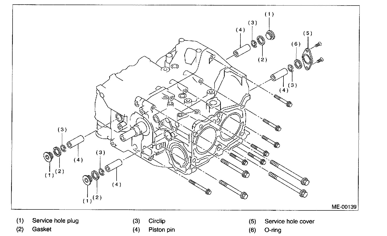 25) Rotate the crankshaft to bring #1 and #2 pistons to bottom dead center position, then remove the piston circlip through service hole of #1 and #2 cylinders.