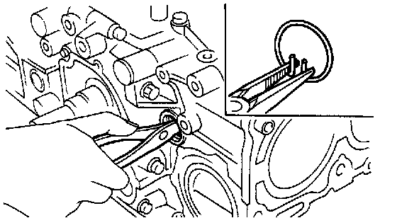 23) Remove the oil pump from cylinder block. Use a flat-bladed screwdriver as shown in the figure when removing the oil pump.