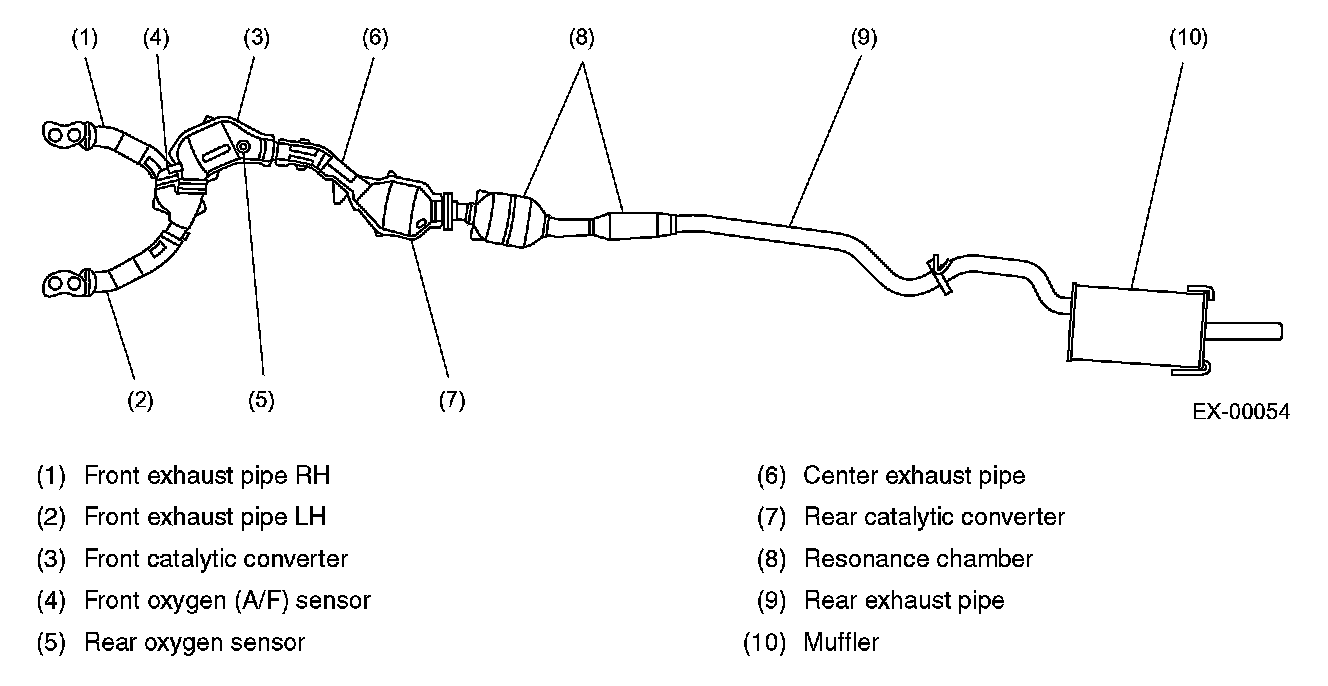 The exhaust system consists of front exhaust pipes, catalytic converters, a center exhaust pipe, a rear exhaust pipe and a muffler. The front catalytic converter and rear catalytic converter are incorporated in the center exhaust pipe.