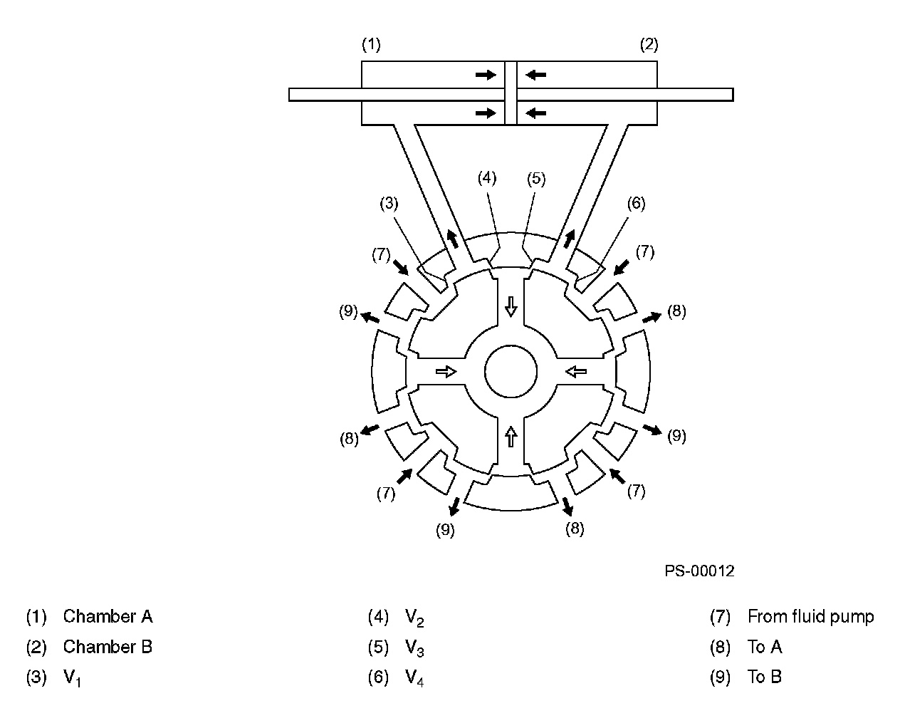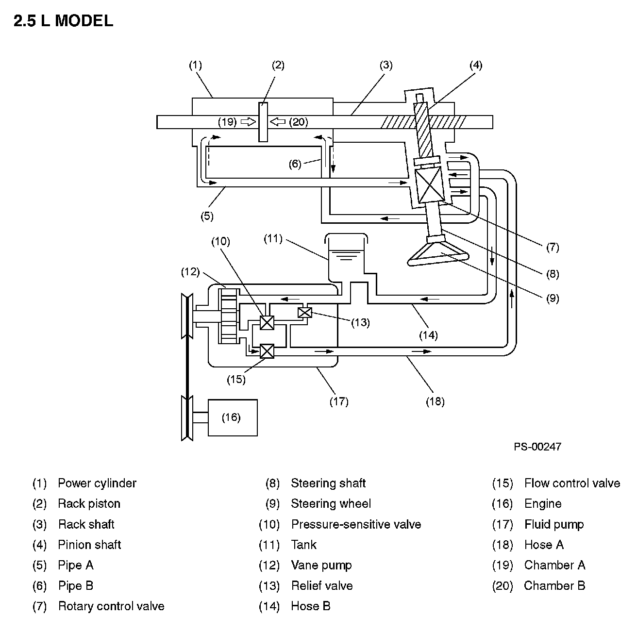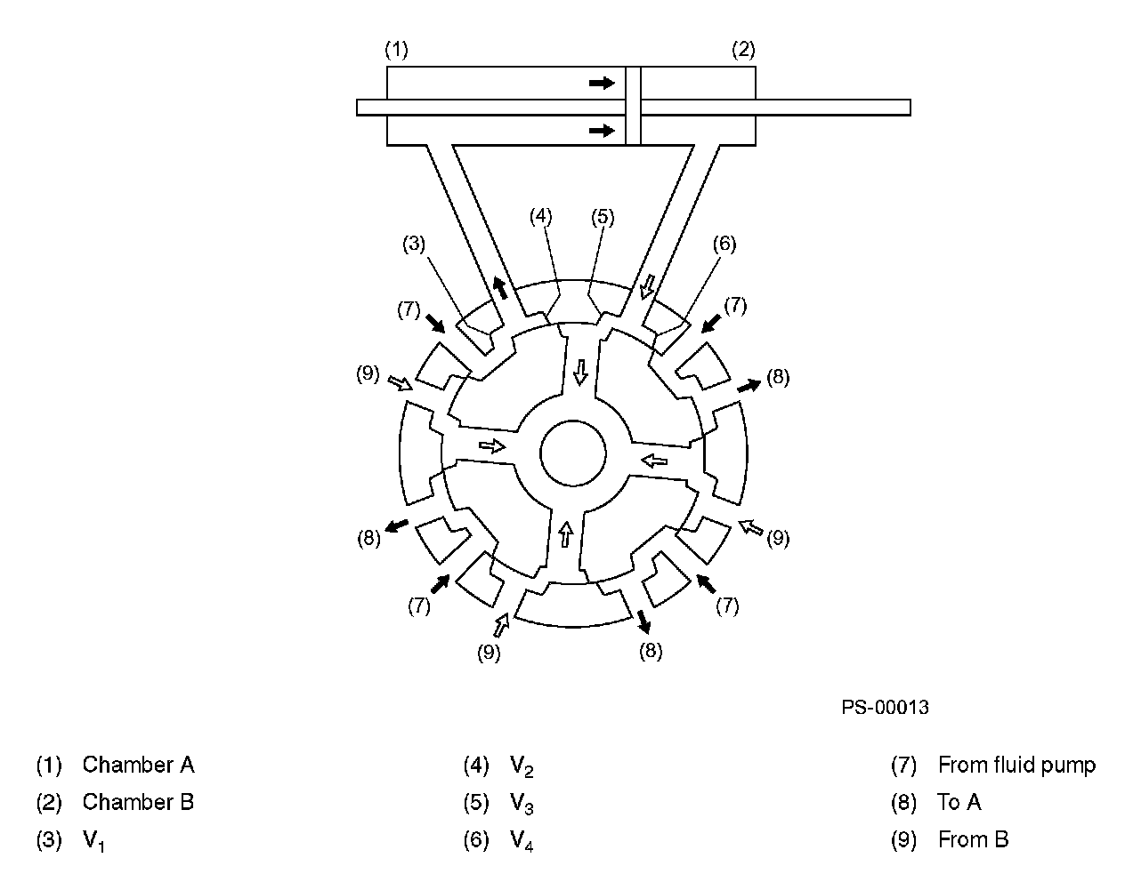 - Movement of the rack piston causes the fluid in the other chamber to return to the reservoir tank via pipe A or B, control valve, and hose B.