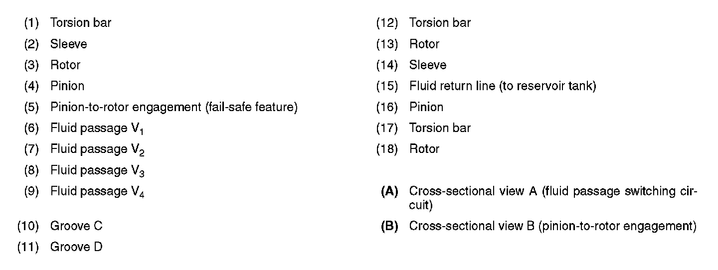 The rotary control valve consists of a rotor (which rotates together with the steering shaft), a pinion (which is connected to the rotor and torsion bar), and a sleeve (which rotates together with the pinion). The rotor and sleeve have grooves C and D, respectively, which form fluid passages V1 through V4.