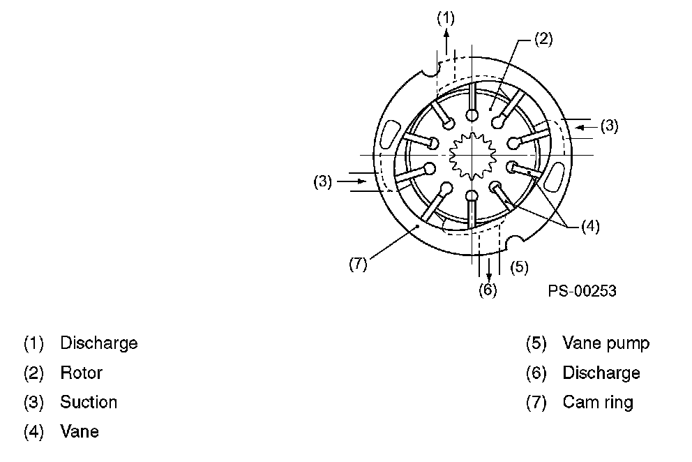When the rotor rotates, the vane movably fitted in each slot of the rotor is radially moved out by centrifugal force and pressed against the inside wall of the cam ring. Since the inside of the cam ring is oval-shaped, the fluid from the suction port is confined and pressurized in the chamber formed between two adjacent vanes as the rotor rotates and is delivered through the discharge port. The pressurized fluid circulates through the hydraulic circuit.