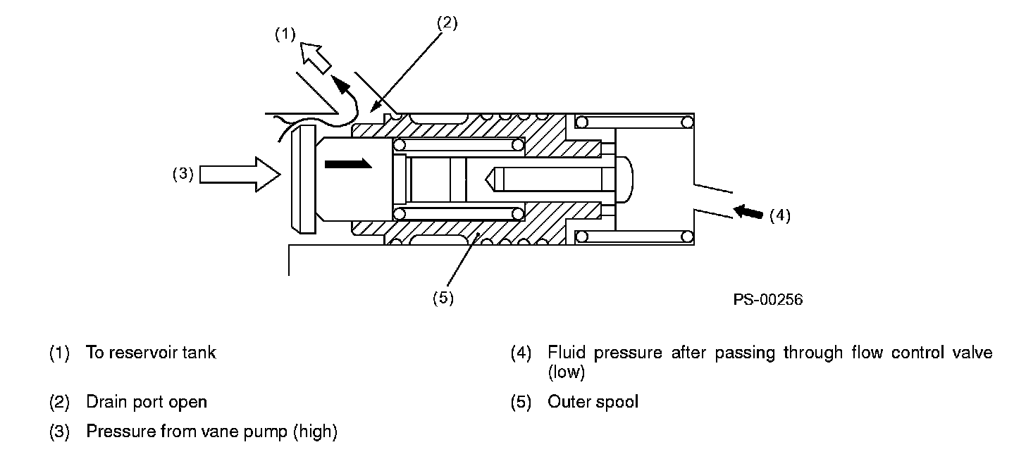 On the other hand, the pressure acting on the left end of valve is the fluid pump-discharge pressure which is higher than the pressure acting on the right end. This causes the pressure-sensitive valve's spool assembly to move to the right. As a result, the drain port which was closed by the outer spool is now opened. The pump discharged fluid then flows to the reservoir tank and the pressure inside the pump is reduced.
