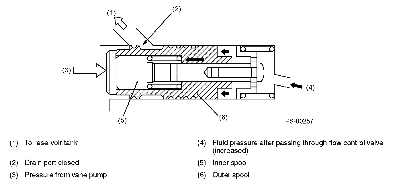 The inner spool of the pressure-sensitive valve is kept pressed to the right by the pump-discharge pressure acting on its left end. On the other hand, the fluid pressure acting on the right end of the valve is also high. So, the outer spool is moved to the left, closing the drain port. As a result, the pump internal pressure increases so that the fluid with a high pressure necessary for power assistance is supplied to the gearbox.