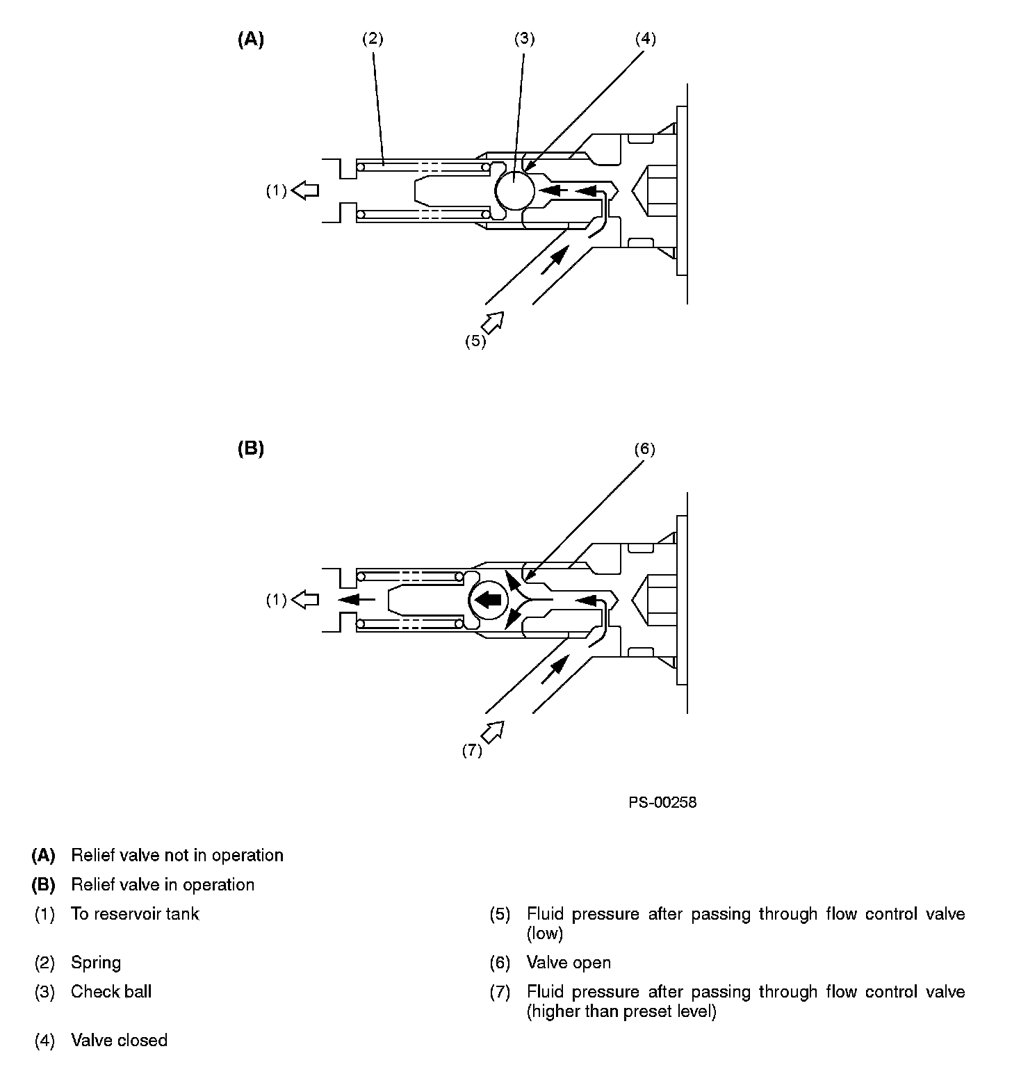 The relief valve consists of a check ball and a spring. The check ball is exposed to the fluid pressure that is regulated by the flow control valve (branched from the line to the steering gearbox).