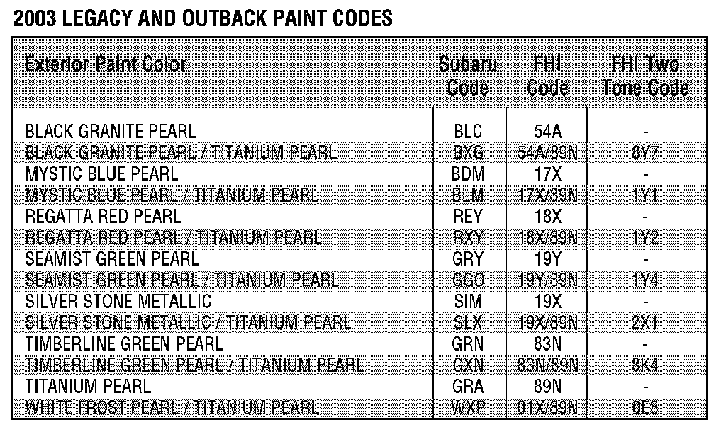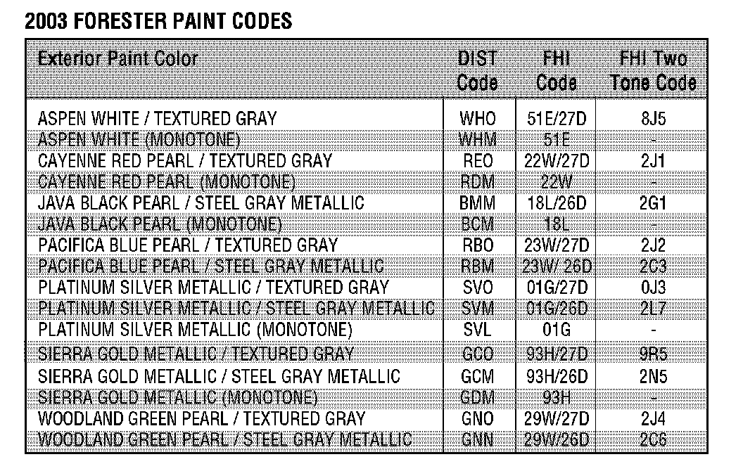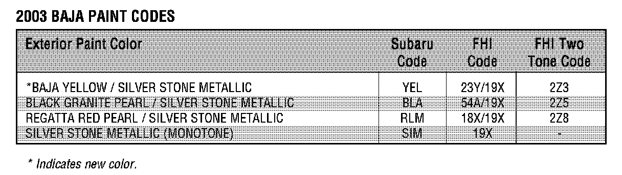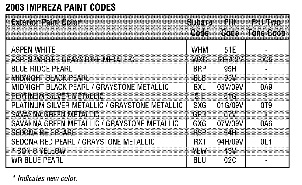 2003 Paint Codes