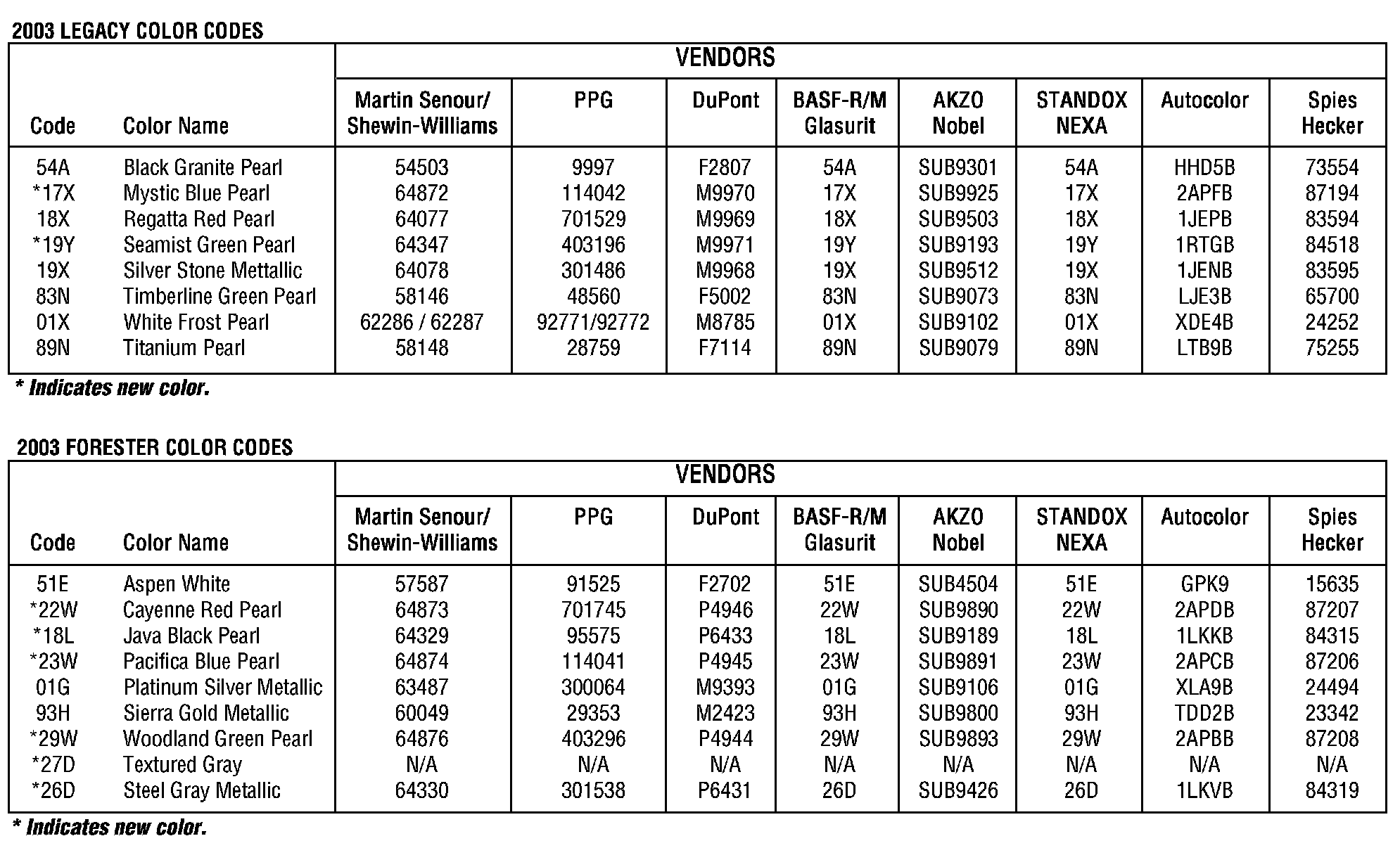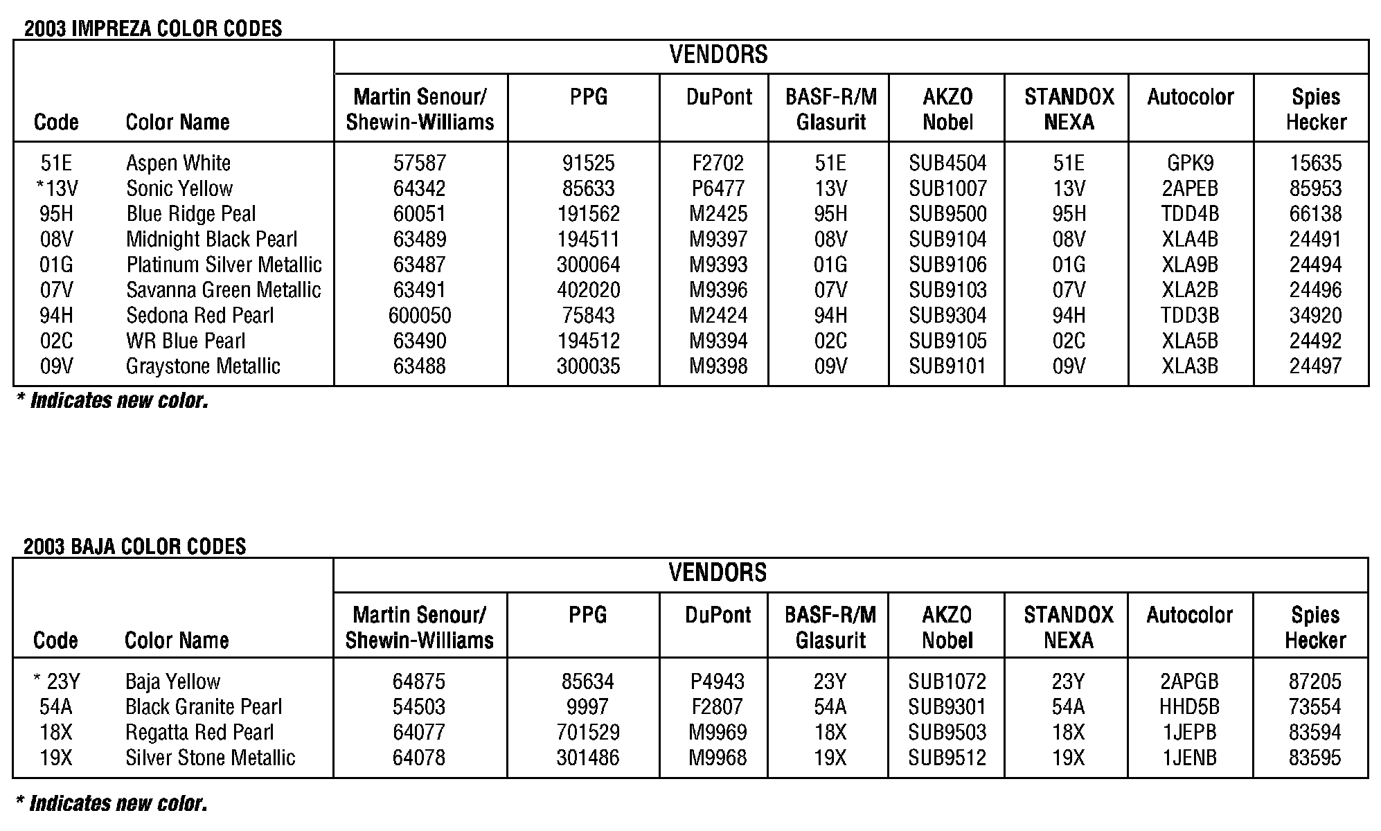 Paint - Paint Codes - All 2003