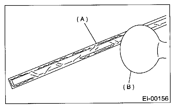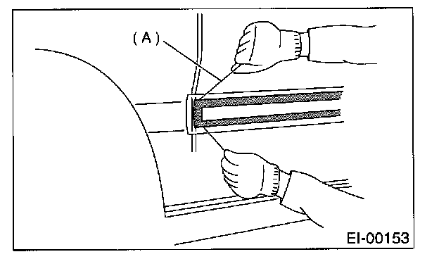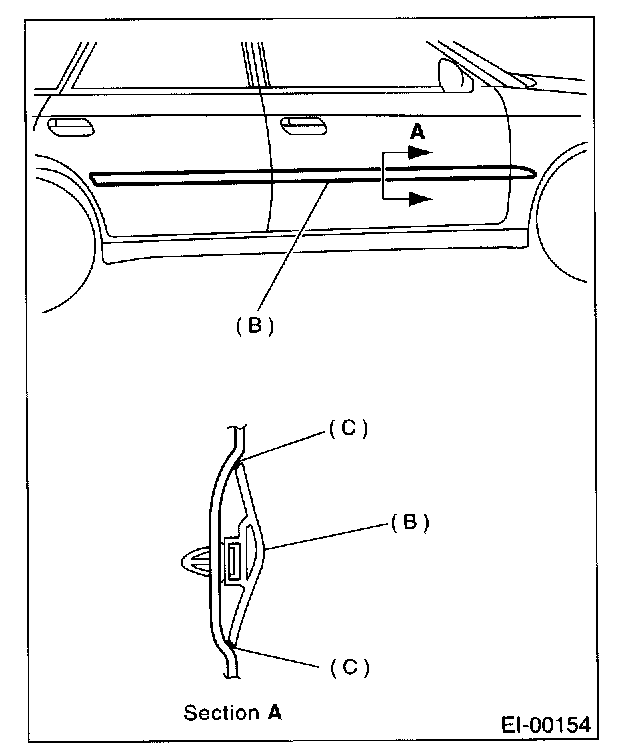 3. Insert fishing line [0.8 mm (0.031 in) dia.] (A) between side protector (B) and vehicle body. Cut (pull the line) through two-sided tape (C) along side protector on the body. Using a puller, remove clips from vehicle body while pulling side protector towards yourself as required.