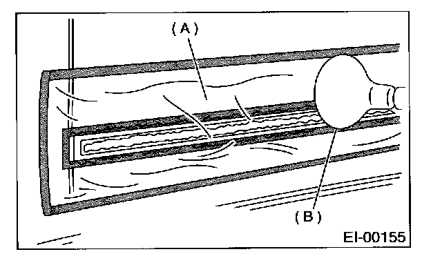 5. Attach plastic wrap (A) to adhesive remover coated areas and heat to 40 to 60°C (104 to 140°F) for 5 to 10 minutes using an infrared lamp (B).