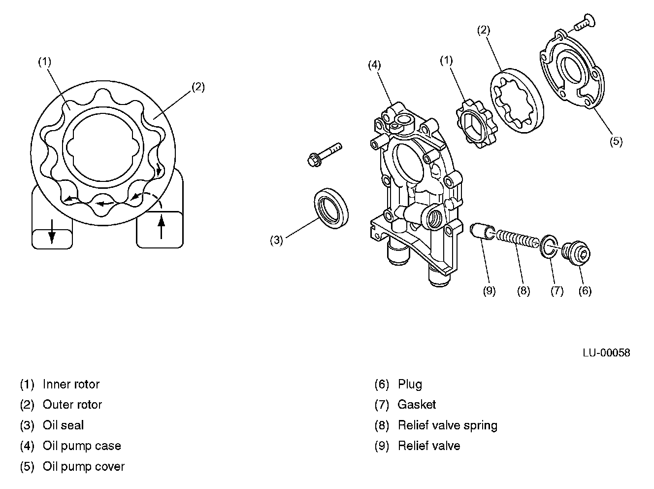 - Engine oil is drawn into the large space created near the inlet of the pump. It is then carried to the discharge port. As the pump rotates, the space carrying the oil becomes smaller, thus the oil is pressurized and discharged from the outlet port. Oil pressure is regulated by the relief valve built into the pump. Excess oil is directly returned to the inlet port.