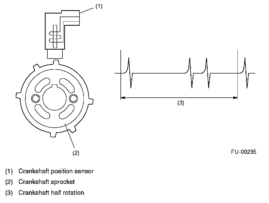 - The crankshaft position sensor is installed on the oil pump which is located in the front center portion of the cylinder block. The sensor generates a pulse when one of the teeth on the perimeter of the crankshaft sprocket (rotating together with the crankshaft) passes in front of it. The ECM determines the crankshaft angular position by counting the number of pulses.