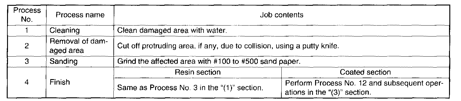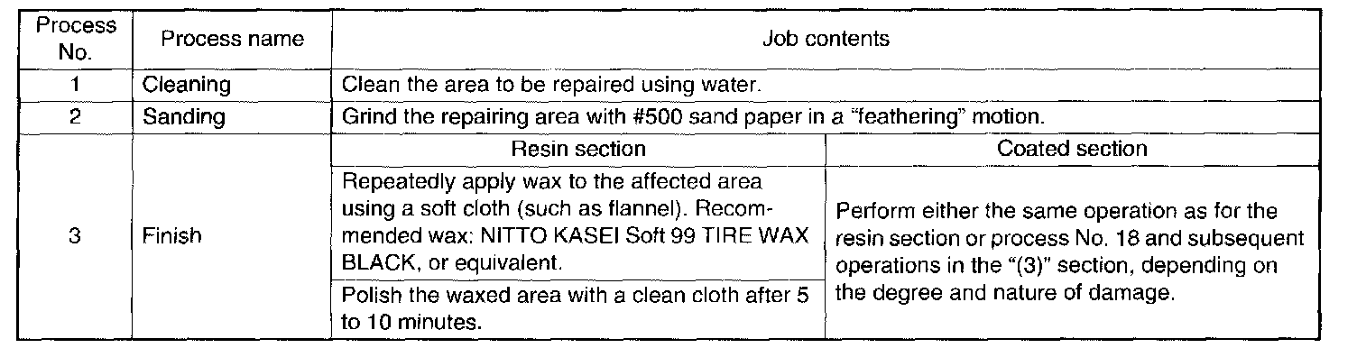 NOTE: All PP bumpers are provided with a grained surface, and if the surface is damaged, it cannot normally be restored to its former condition. Damage limited to shallow scratches that cause only a change in the lustre of the base material or coating, can be almost fully restored. Before repairing a damaged area, explain this point to the customer and get an understanding about the matter. Repair methods are outlined below, based on a classification of the extent of damage.